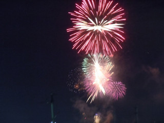 花火(^O^) こんばんは、ごんで〜す。あっちとこっちで花火大会です。毎年、楽しみにしています。ドンドーンと音が響き出すと、あわてて4階まで駈け上がります。大きく見える方は大和郡山市九条公園らしいですが、遠い方のは…どこなんでしょ?